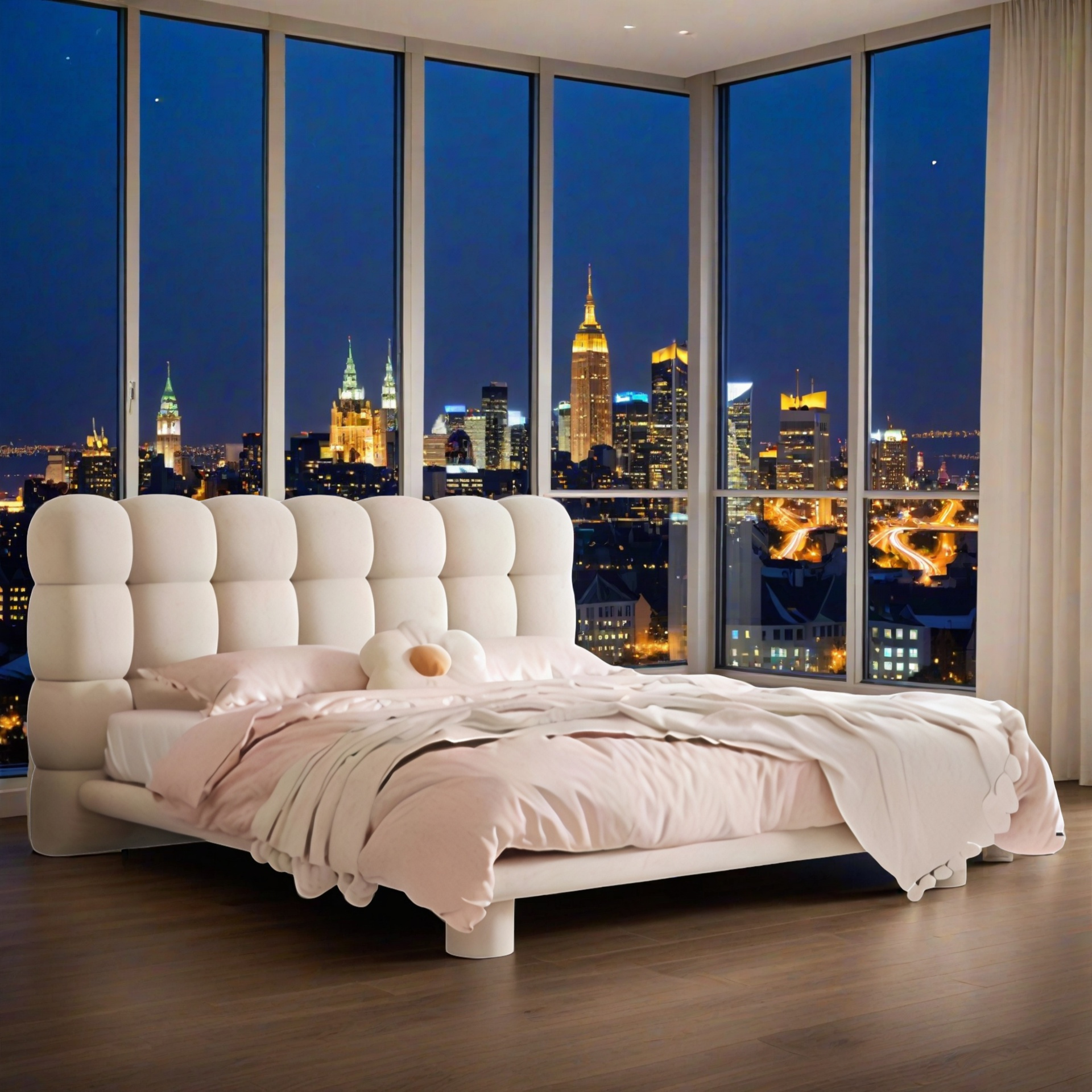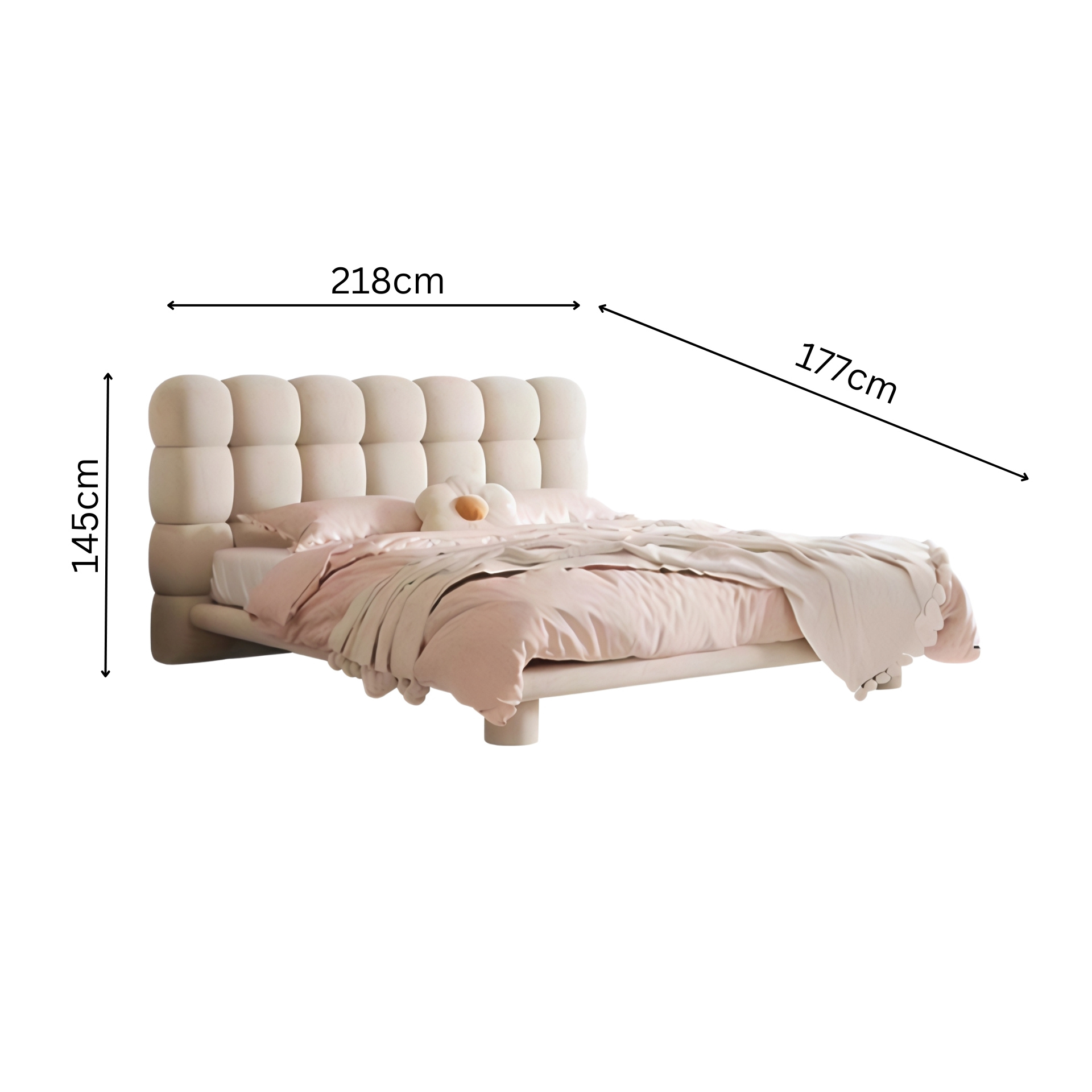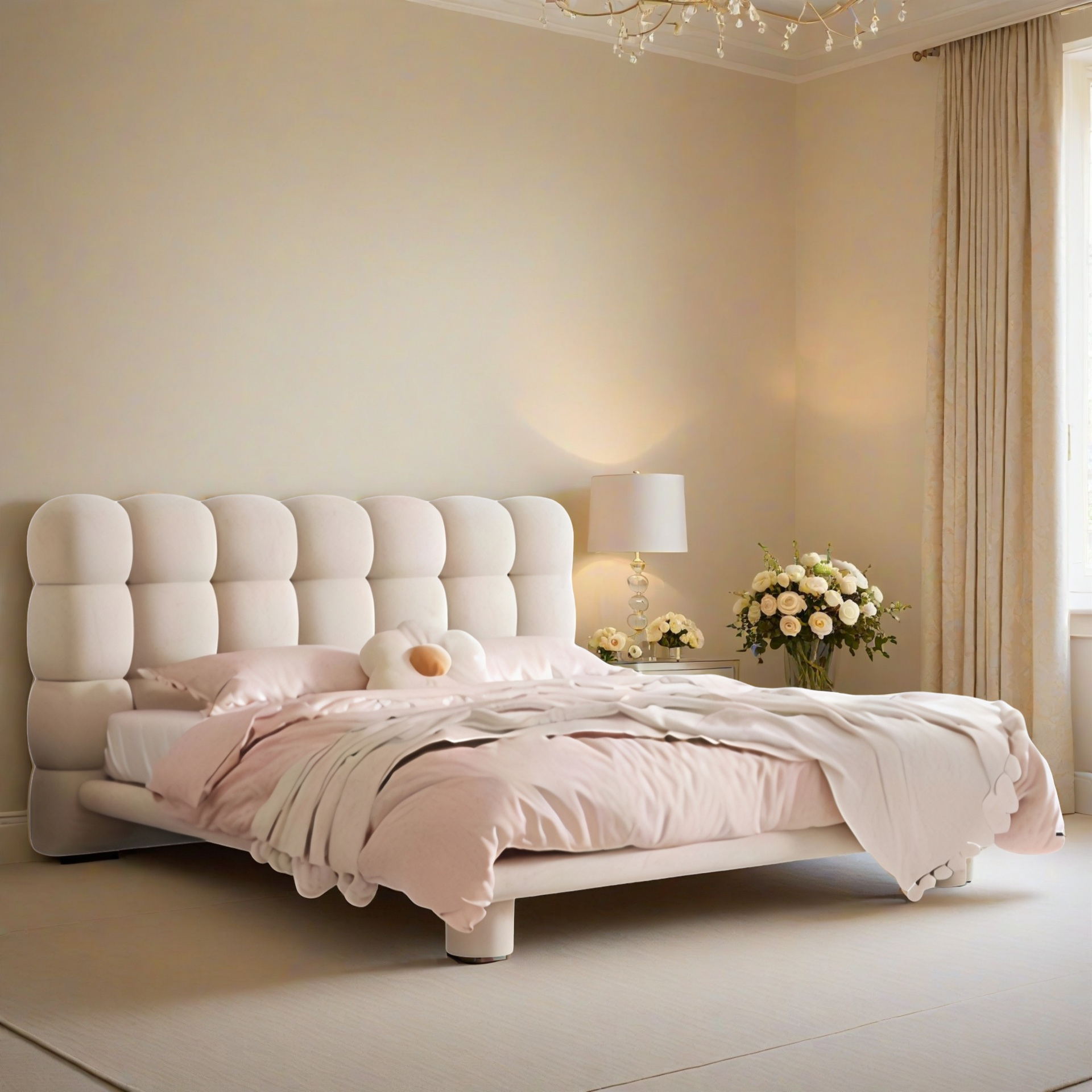 Dieses Bett verbindet modernes Design mit einer sinnlich weichen Ästhetik. Das auffällige, gepolsterte Kopfteil im Kassettenmuster ist ein echter Hingucker und strahlt pure Gemütlichkeit aus. Der zarte Rosaton bringt Wärme und Ruhe in den Raum – ideal für Schlafzimmer, die Komfort und Stil harmonisch vereinen. Die abgerundeten Formen und die weiche Polsterung laden zum Entspannen ein, während die solide Konstruktion aus Holz und Metall für Langlebigkeit und Stabilität sorgt. Das Bett vereint funktionale Qualität mit emotionaler Ausstrahlung und schafft eine Atmosphäre von Geborgenheit und Modernität zugleich. Ein Bett, das nicht nur zum Schlafen, sondern auch zum Träumen inspiriert – perfekt für Menschen, die Design, Komfort und Behaglichkeit gleichermaßen schätzen.
