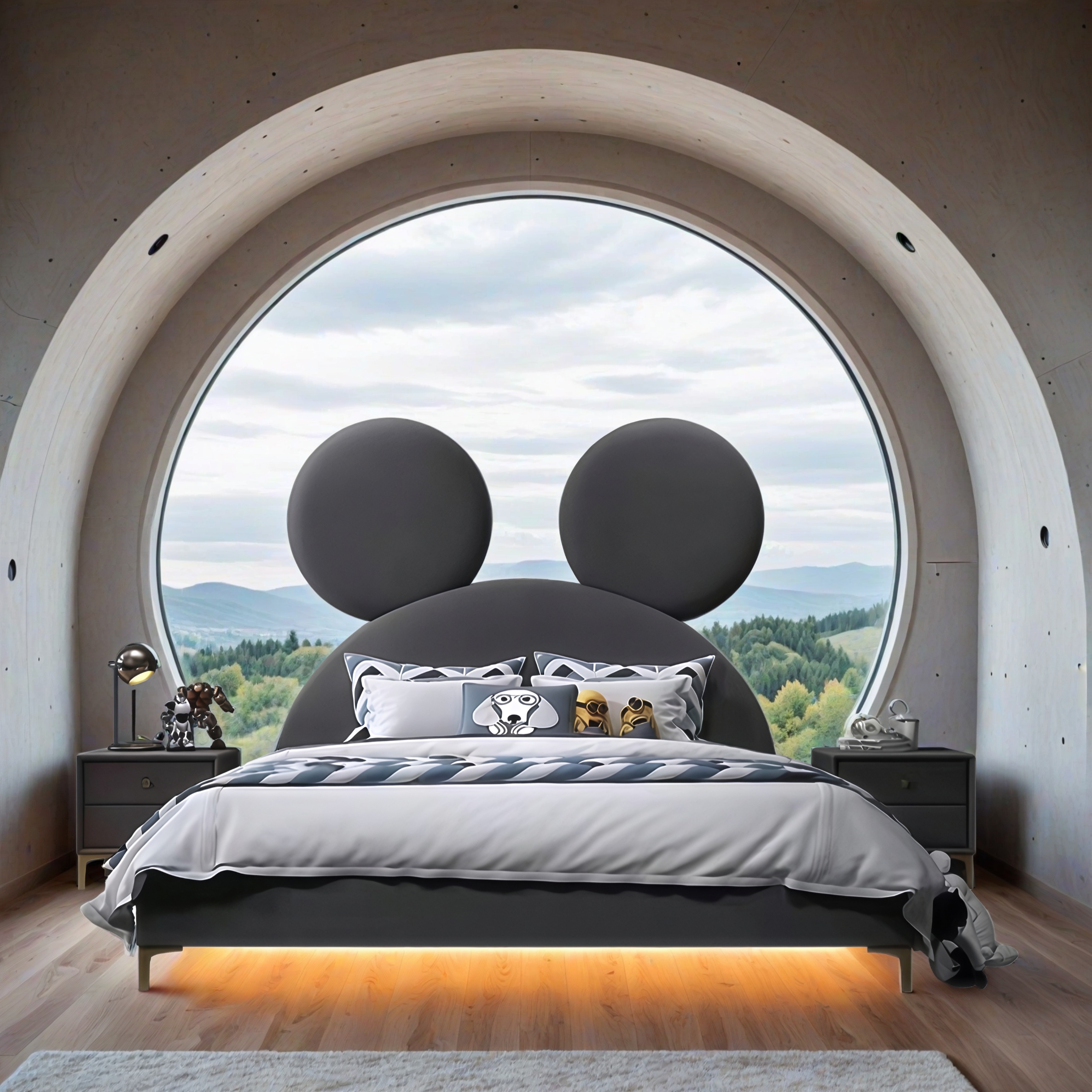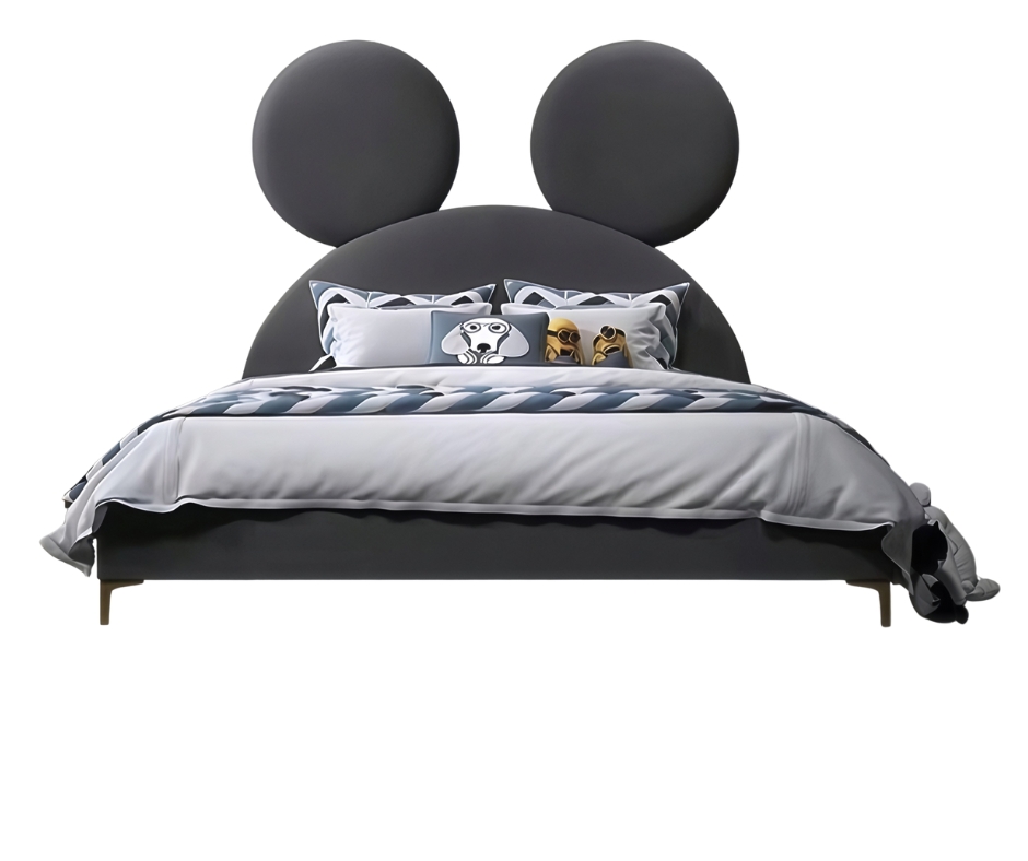 Dieses Kinderbett begeistert durch sein außergewöhnliches Design und seine liebevolle Verarbeitung. Das markante Kopfteil mit den großen, runden Formen erinnert an ikonische Cartoon-Figuren und zaubert sofort ein Lächeln ins Gesicht – perfekt für kleine Träumer und kreative Köpfe. Das Bett vereint spielerische Ästhetik mit höchstem Komfort. Die weichen Polsterflächen sorgen für Sicherheit und Behaglichkeit, während der robuste Rahmen Stabilität und Langlebigkeit garantiert. Das dezente Farbschema in Grau und Weiß schafft eine moderne Atmosphäre, die sich leicht mit verschiedenen Kinderzimmerstilen kombinieren lässt. Ob zum Schlafen, Lesen oder Spielen – dieses Bett ist nicht nur ein funktionales Möbelstück, sondern auch ein Ausdruck von Fantasie und Persönlichkeit. Eltern schätzen die hochwertige Verarbeitung, Kinder lieben das einzigartige Design. Ein Statement-Möbel für jedes moderne Kinderzimmer – komfortabel, langlebig und mit einem Hauch von Magie.