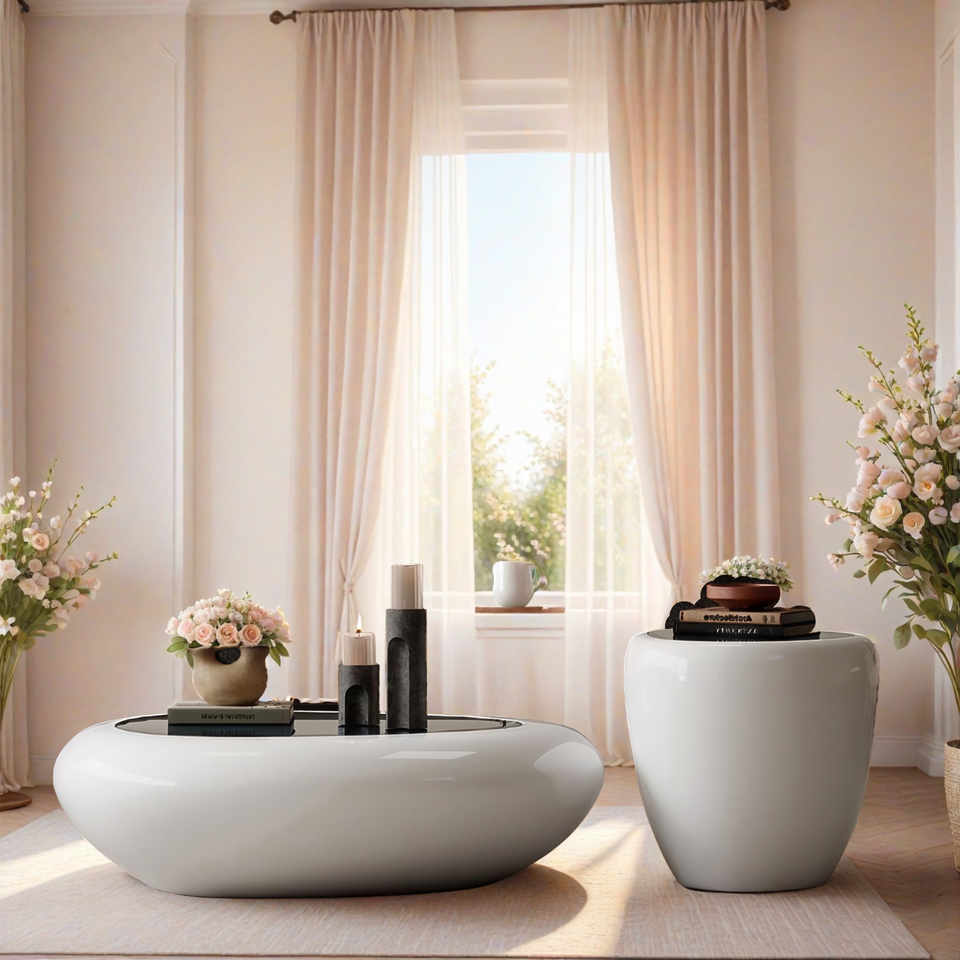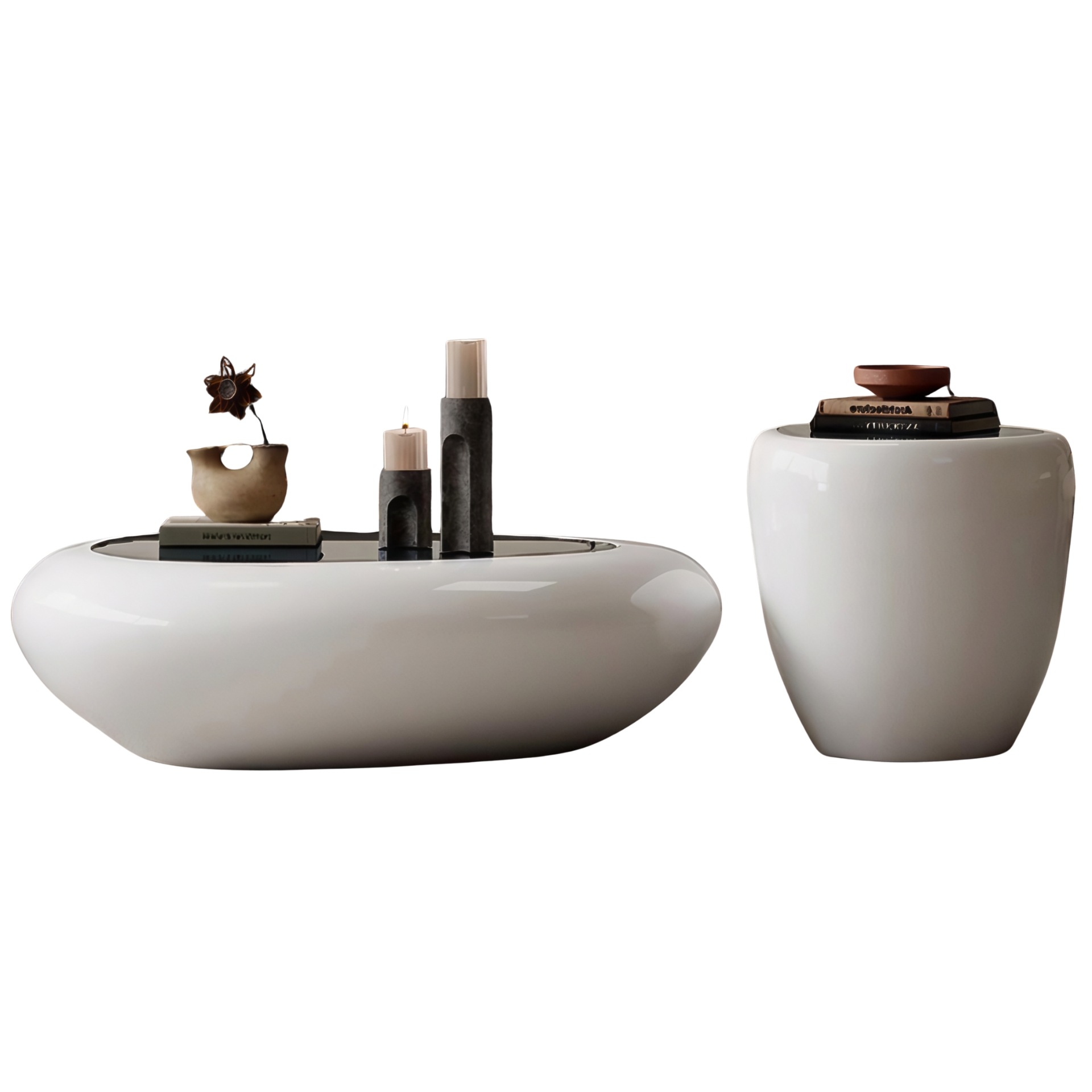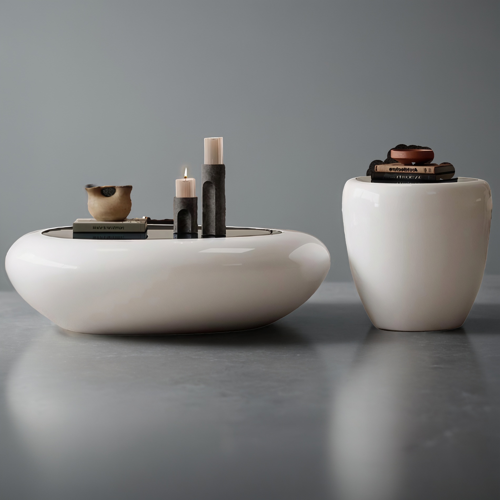 Dieses Tisch-Set verk�rpert pure Eleganz in ihrer einfachsten Form. Mit ihrer sanft gerundeten Silhouette und der makellos gl�nzenden Oberfl�che erinnern die beiden Tische an moderne Kunstobjekte, die Funktion und �sthetik m�helos miteinander verbinden. Das Set besteht aus zwei unterschiedlich hohen Elementen � einer flachen, breiten Variante und einem h�heren, zylindrischen Begleittisch. Gemeinsam schaffen sie ein harmonisches Ensemble, das jeden Raum durch seine ruhige Ausstrahlung und skulpturale Pr�senz bereichert. Die glatte Hochglanzoberfl�che reflektiert das Licht dezent und l�sst die Tische wie handgefertigte Keramik erscheinen. Ob im Wohnzimmer, in der Lounge oder im Eingangsbereich � diese Designst�cke setzen stilvolle Akzente und bieten gleichzeitig Platz f�r Dekorationen, B�cher oder Accessoires. Ein minimalistisches Meisterwerk, das durch seine organische Form und hochwertige Verarbeitung besticht � perfekt f�r alle, die modernes Wohndesign lieben und klare Formen mit emotionaler Tiefe sch�tzen.