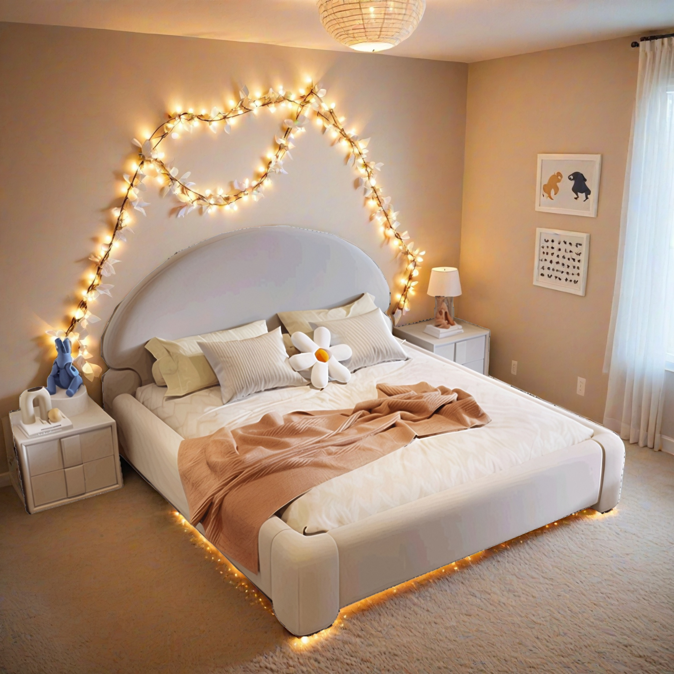 Dieses stilvolle Designerbett vereint organische Formen mit moderner Behaglichkeit. Das geschwungene Kopfteil mit seiner sanften Linienführung wirkt harmonisch und beruhigend – perfekt für ein Schlafzimmer mit natürlicher Atmosphäre. Der gepolsterte Rahmen sorgt für weichen Komfort, während die abgerundeten Ecken das Design elegant abrunden. Die helle Farbgestaltung in Creme und Beigetönen vermittelt Leichtigkeit und zeitlose Eleganz. Das Bett lässt sich ideal mit Holz- oder Pastelltönen kombinieren und passt sowohl in moderne als auch in skandinavisch inspirierte Interieurs. Dank der hochwertigen Verarbeitung und robusten Materialien bietet dieses Modell nicht nur optischen Genuss, sondern auch hervorragenden Liegekomfort und Langlebigkeit. Ein Highlight ist das charmante Blumen-Kissen, das dem Gesamtbild eine verspielte Note verleiht. Ein luxuriöses Möbelstück für Menschen, die modernes Design und natürliche Gemütlichkeit gleichermaßen schätzen.