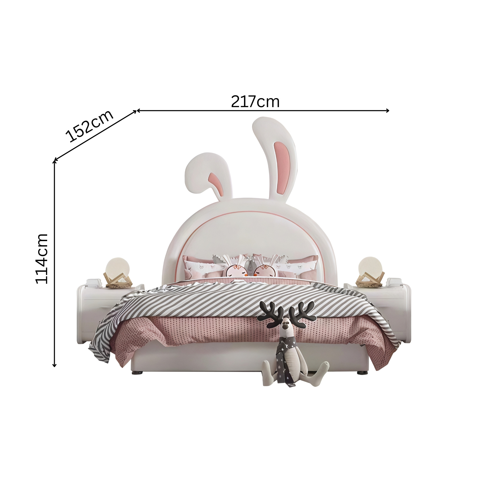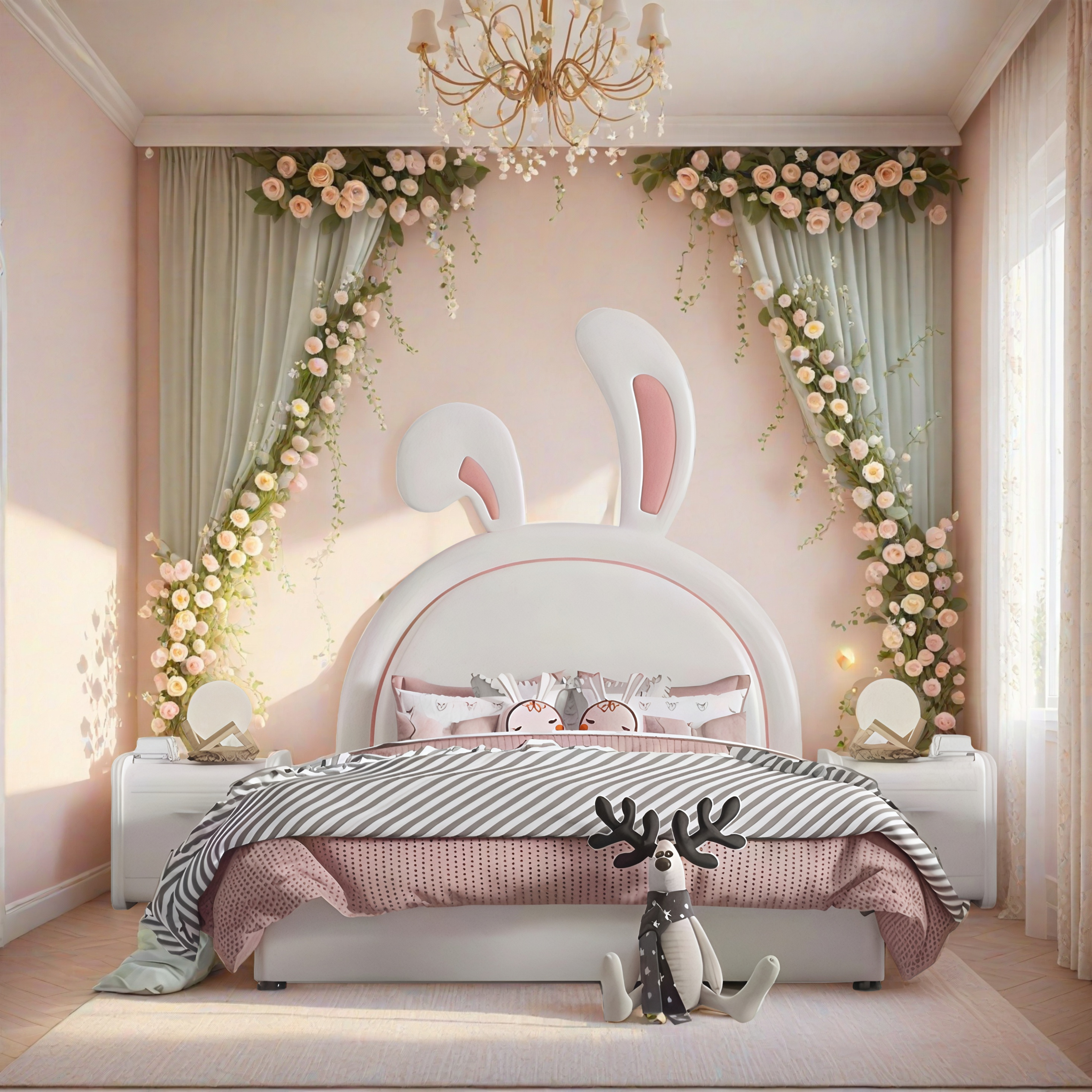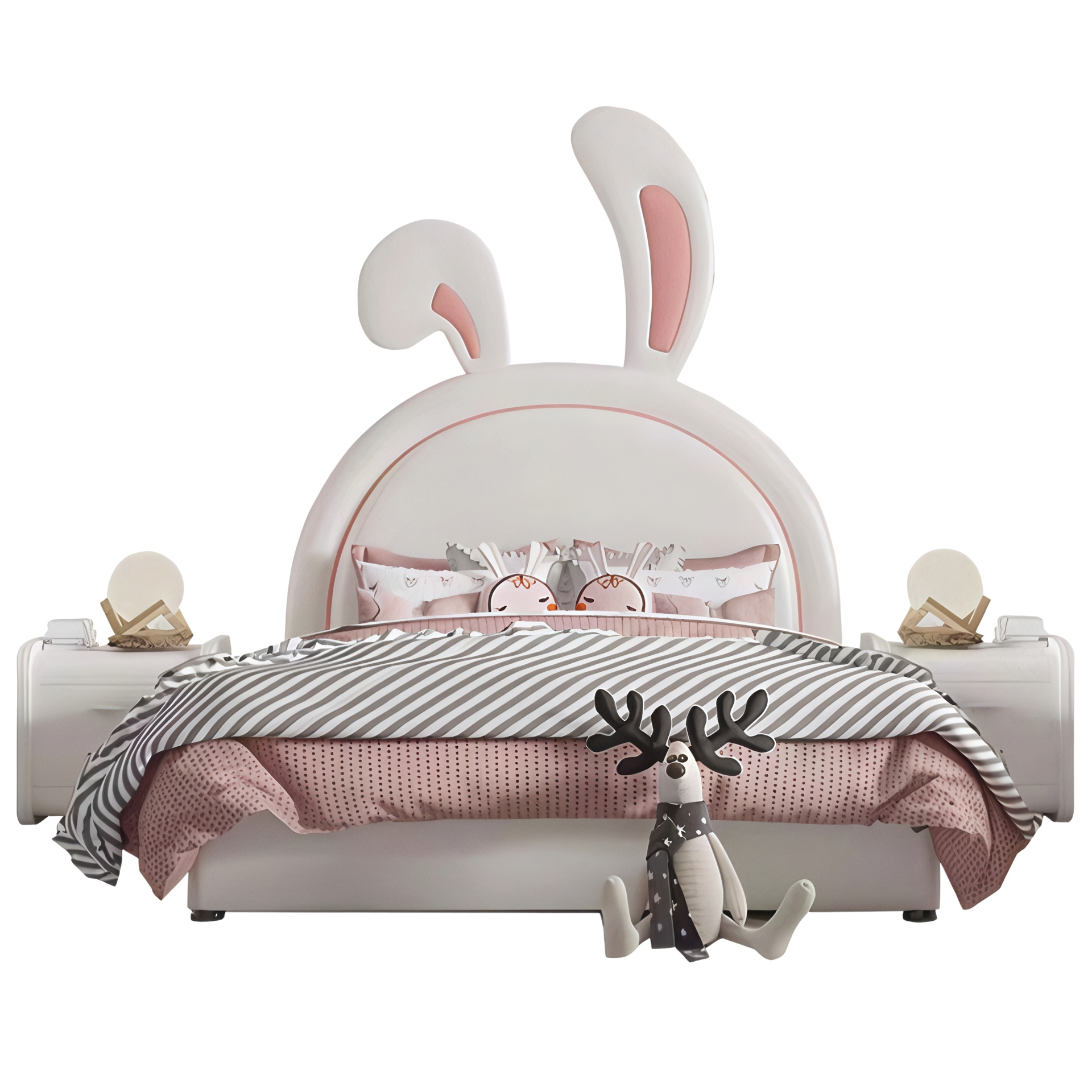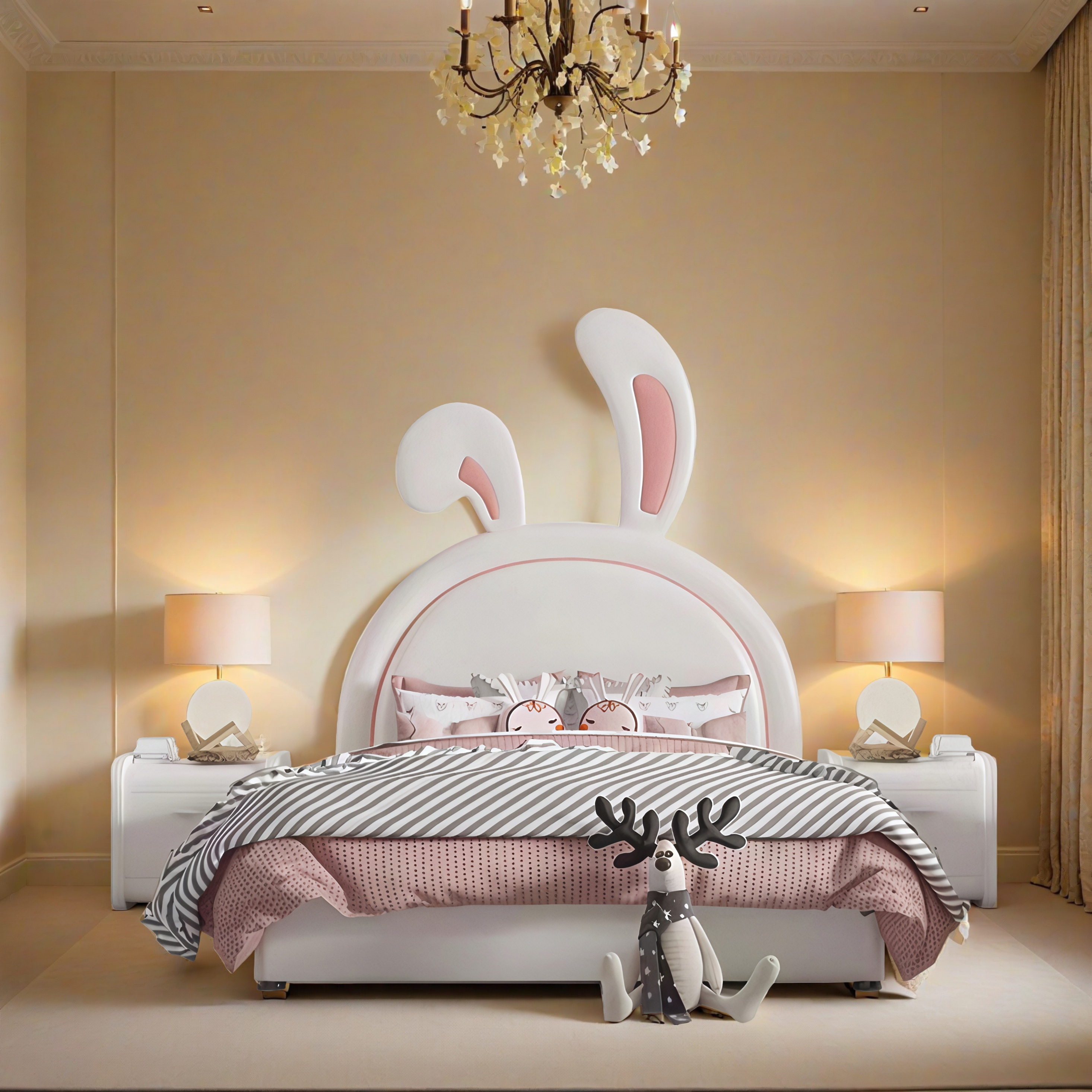 Dieses bezaubernde Kinderbett ist mehr als nur ein Schlafplatz – es ist ein Ort zum Träumen, Spielen und Wohlfühlen. Das markante Hasen-Design mit weichen, abgerundeten Formen und gepolstertem Kopfteil bringt Freude in jedes Kinderzimmer. Die sanften Rosa- und Weißtöne schaffen eine friedliche, harmonische Atmosphäre, in der sich Kinder sicher und geborgen fühlen. Hergestellt aus hochwertigen Materialien, vereint das Bett charmante Optik mit Stabilität und Funktionalität. Das gepolsterte Kopfteil bietet Schutz und Komfort, während die solide Konstruktion für dauerhafte Haltbarkeit sorgt. Ein liebevolles Detail sind die Hasenohren am Kopfteil – ein echter Hingucker, der Kinderherzen höher schlagen lässt. Dieses Bett inspiriert zu Fantasie, Kreativität und sorgt gleichzeitig für erholsamen Schlaf. Perfekt geeignet für kleine Abenteurer und Träumer, die ein Bett mit Persönlichkeit und Herz suchen.