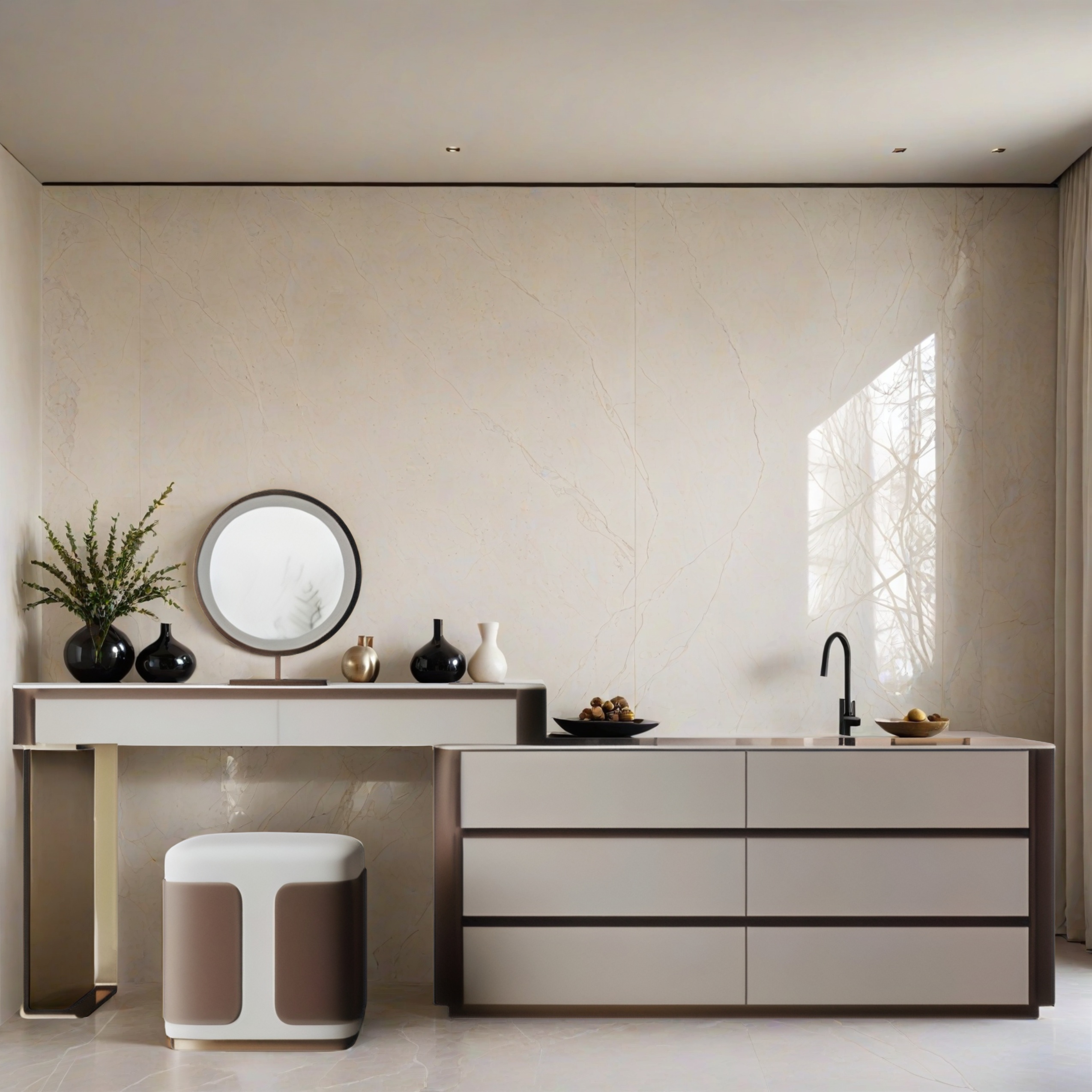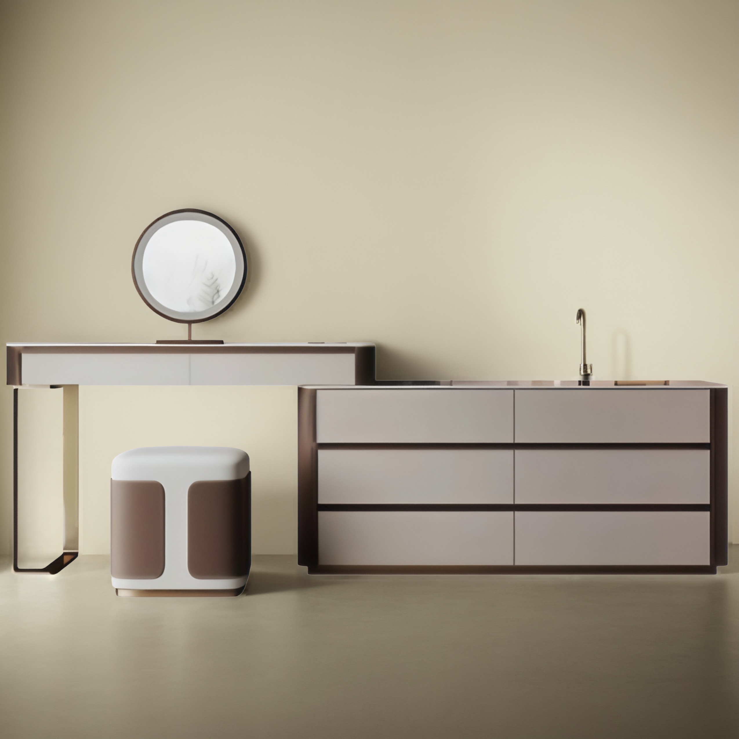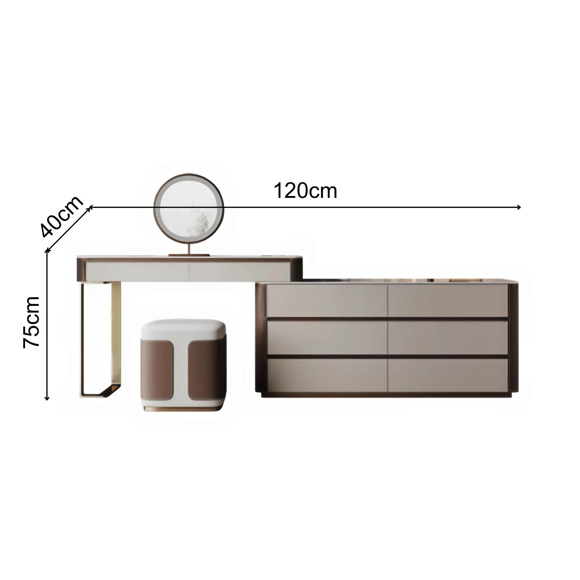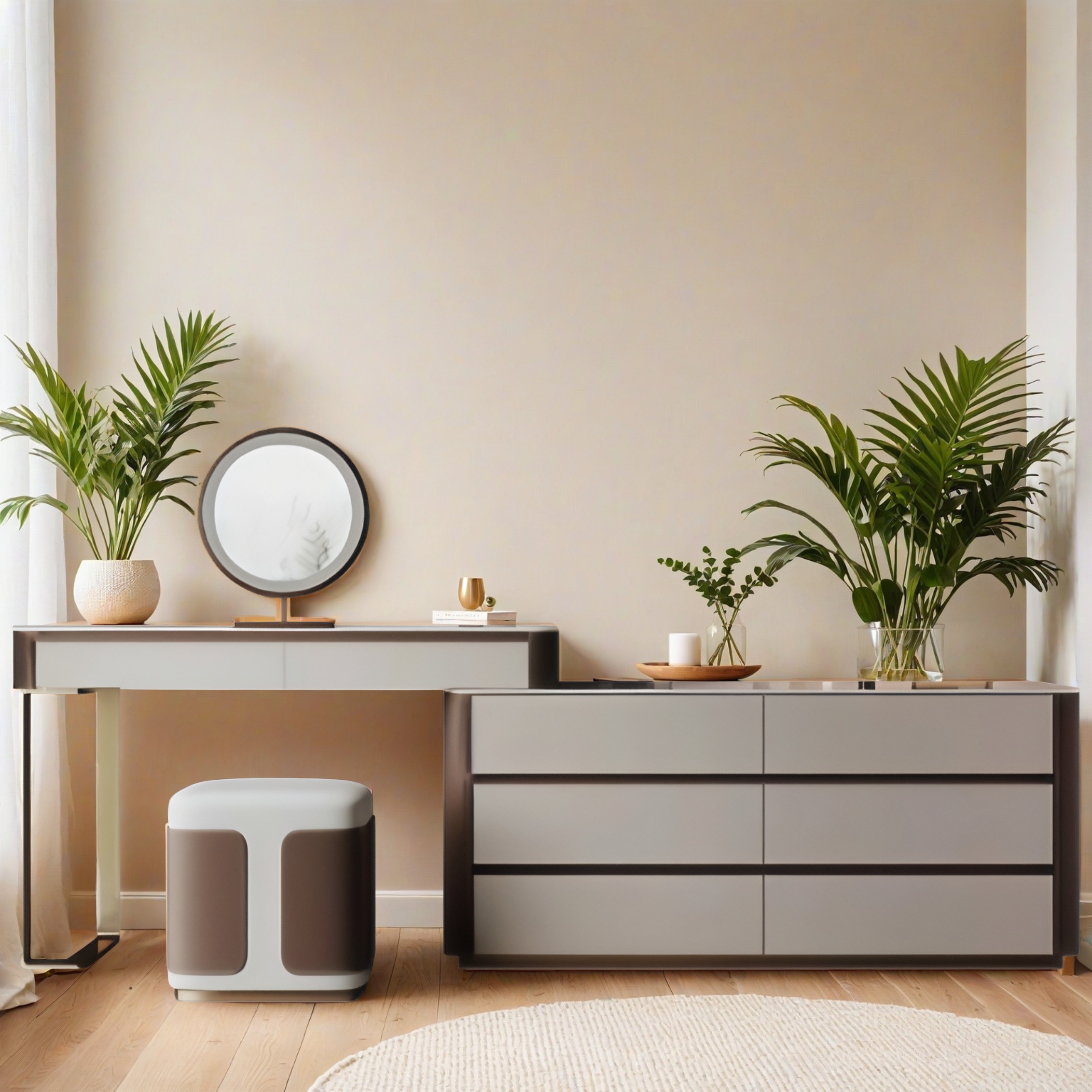 Dieser luxuri�se Schminktisch vereint modernes Design mit zeitloser Eleganz. Die Kombination aus sanften Creme- und Braunt�nen sorgt f�r eine warme, stilvolle Atmosph�re. Mit integriertem LED-Spiegel, gro�em Stauraum in mehreren Schubladen und einem gepolsterten Hocker ist er die perfekte Wahl f�r anspruchsvolle Schlafzimmer und Ankleidezimmer.